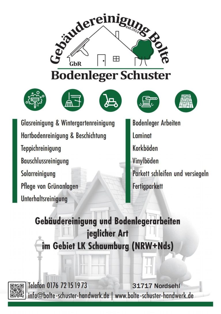 Wenn Sie in Niedersachsen oder Nordrhein-Westfalen, insbesondere im Landkreis Schaumburg, nach einem kompetenten Partner für Gebäudereinigung suchen, sind Sie bei uns genau richtig. > Kontaktieren < Sie uns noch heute, um mehr über unsere Dienstleistungen zu erfahren!mailto:info@bolte-schuster-handwerk.de